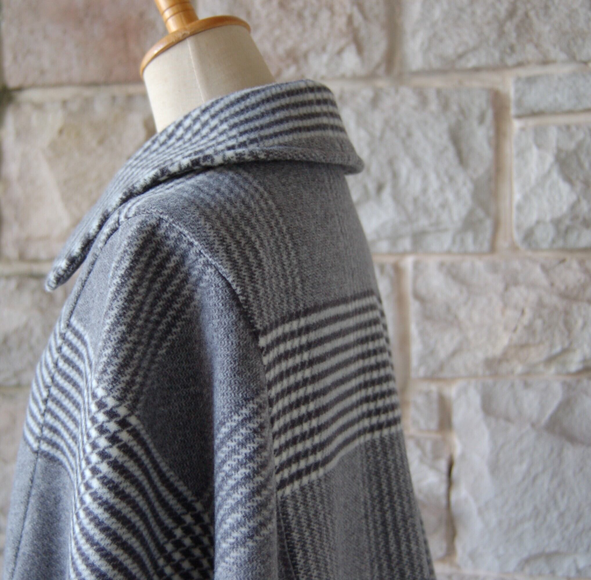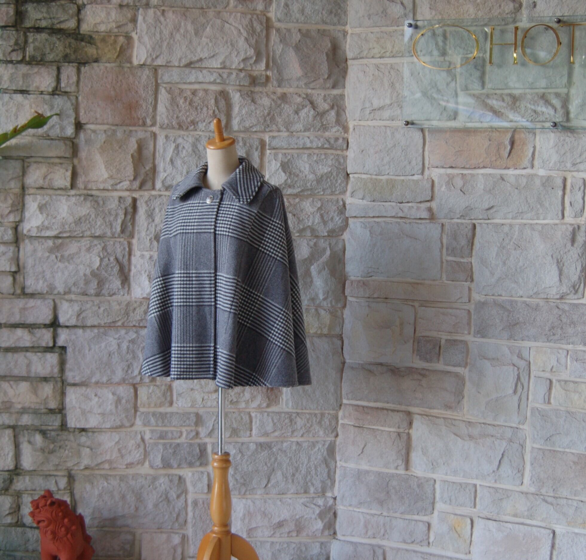 【 ケープコート 】グレンチェック(千鳥格子) モノトーン クラシカル エレガント ウール100% シルバーのボタン