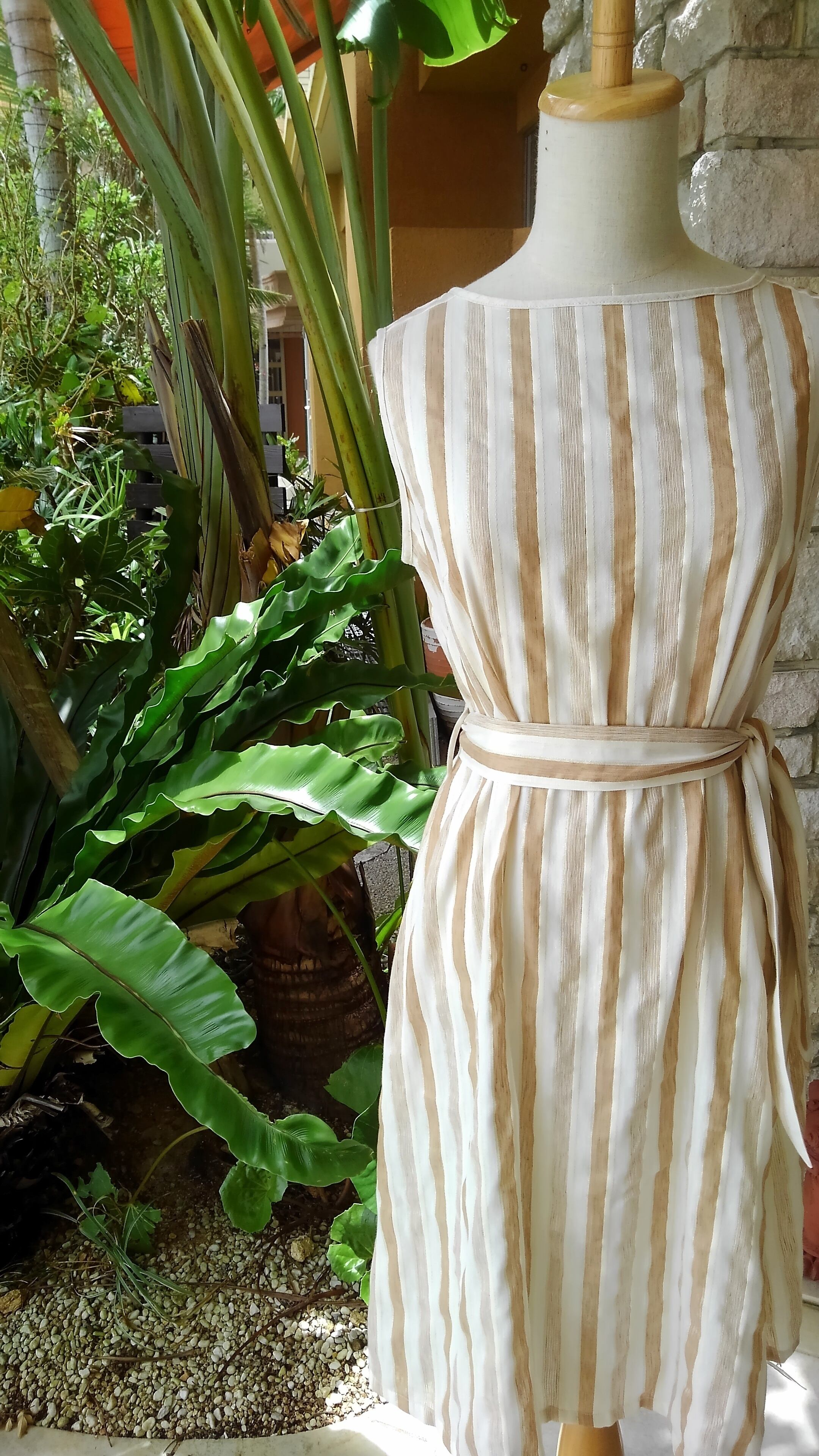 南仏ニース気分 サンドベージュ×ゴールドストライプ リゾート マダム ワンピース