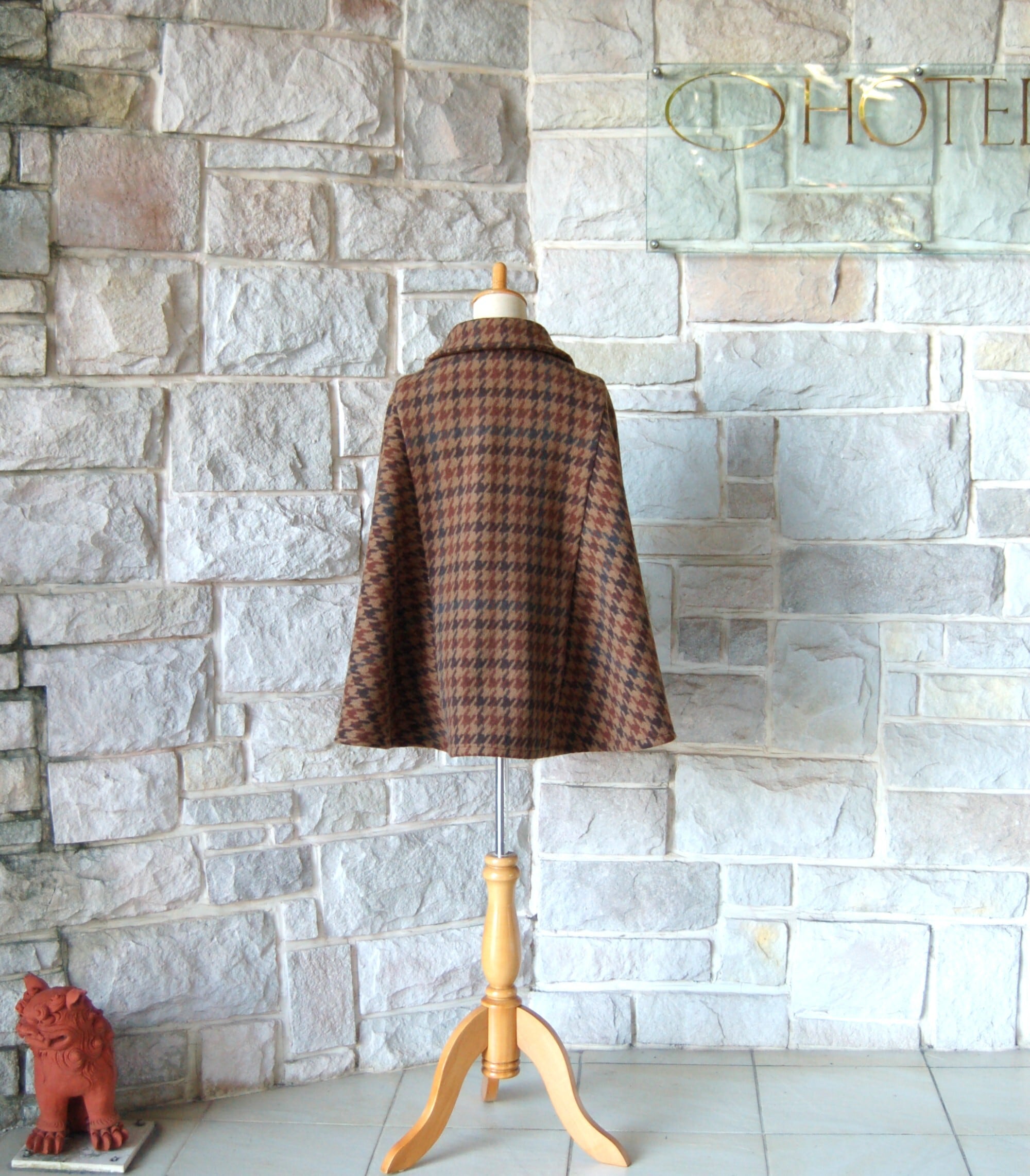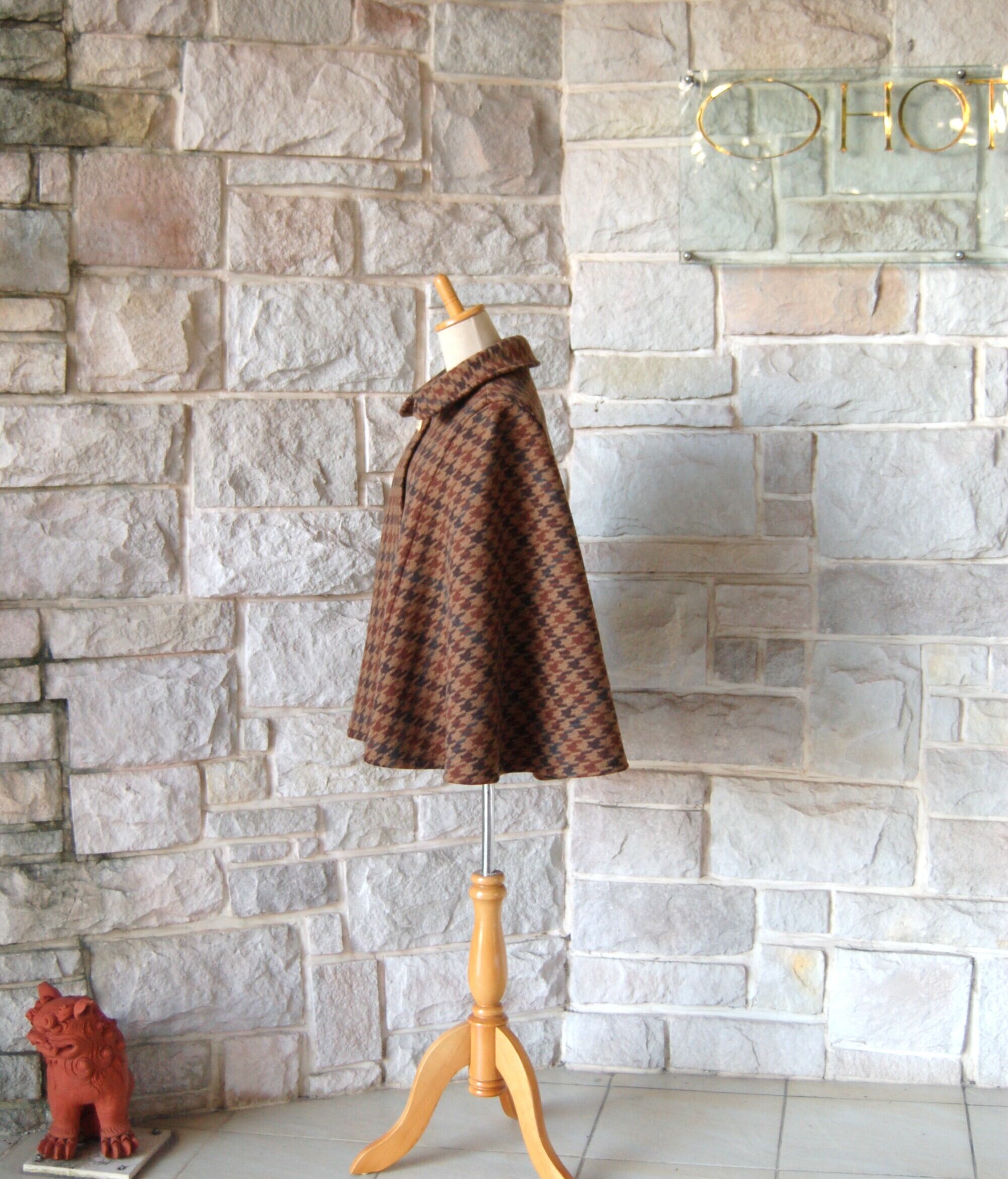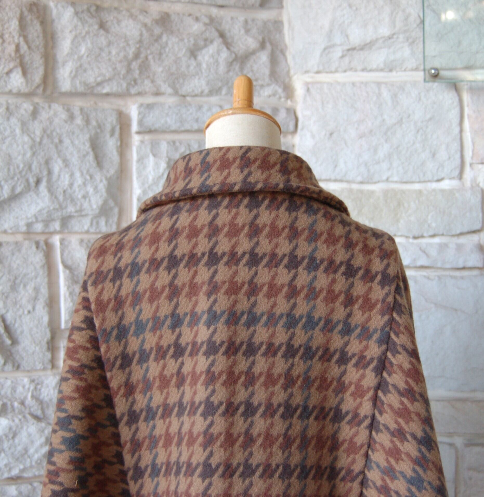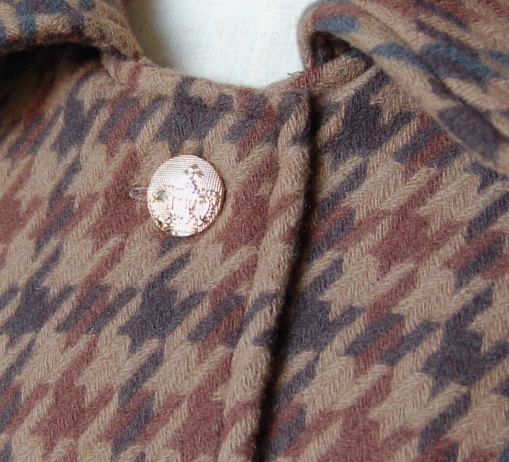 【エレガント ケープ コート】 大柄 ブラウン系 千鳥格子(brown houndstooth)ゴールドクラウンボタン