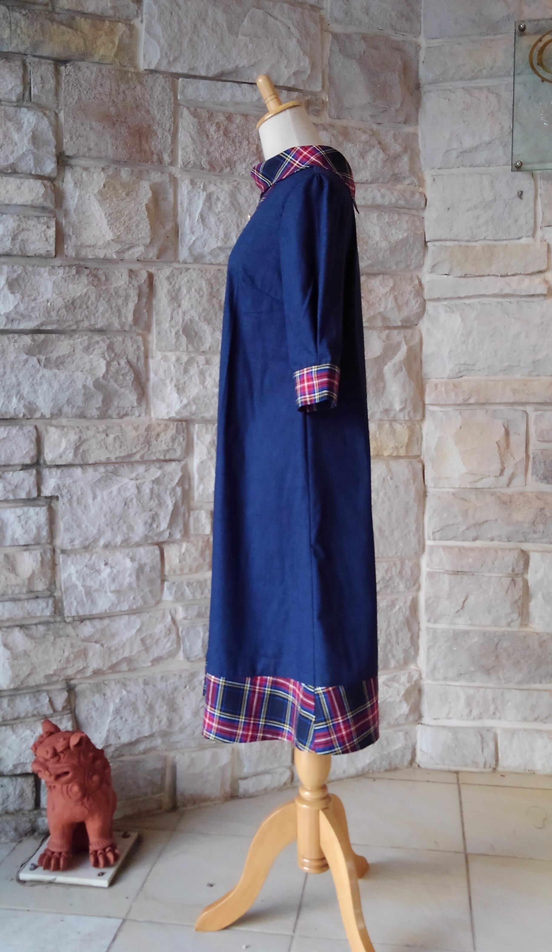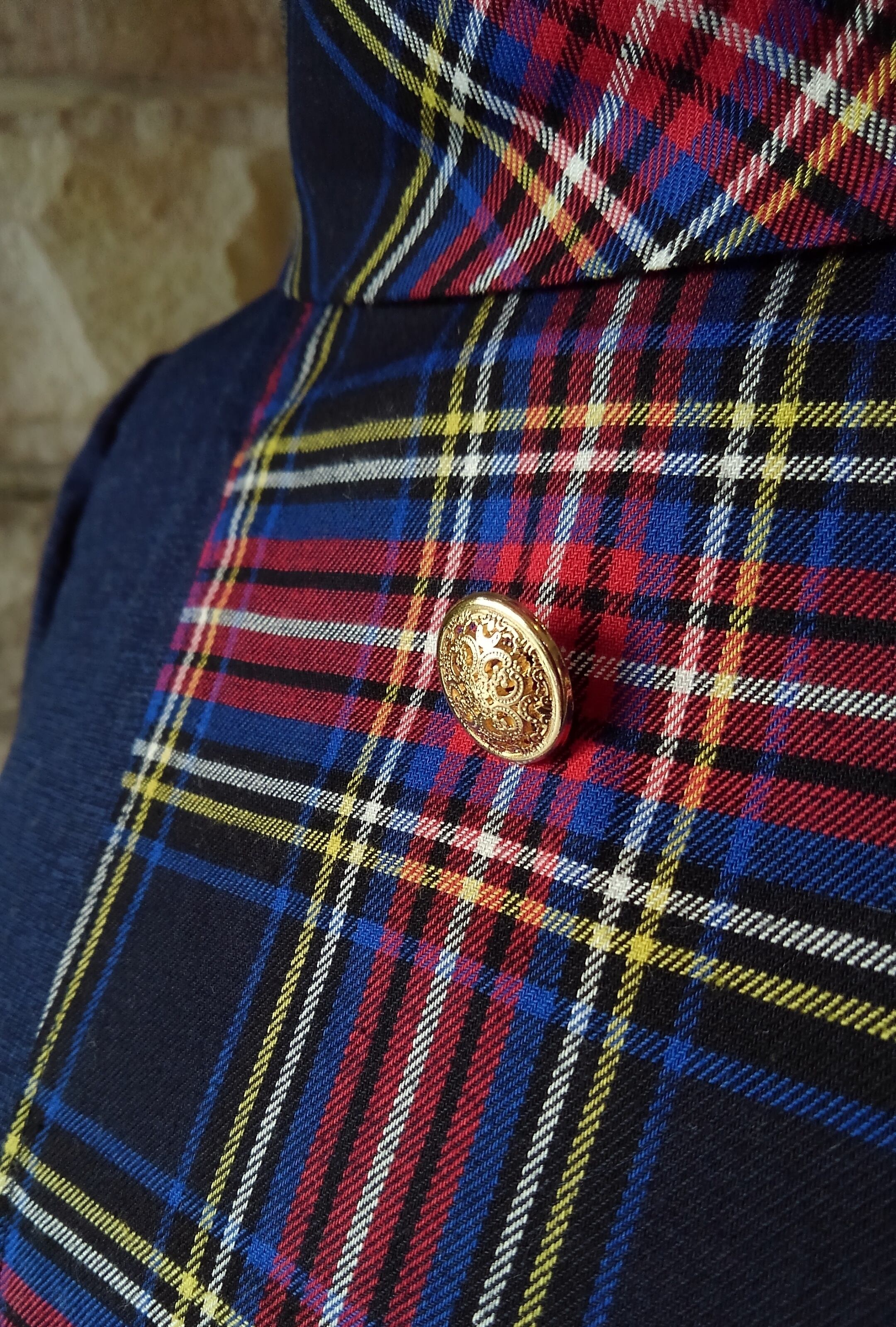 ネイビーの生地と正統派のタータンチェックの生地を組み合わせて、