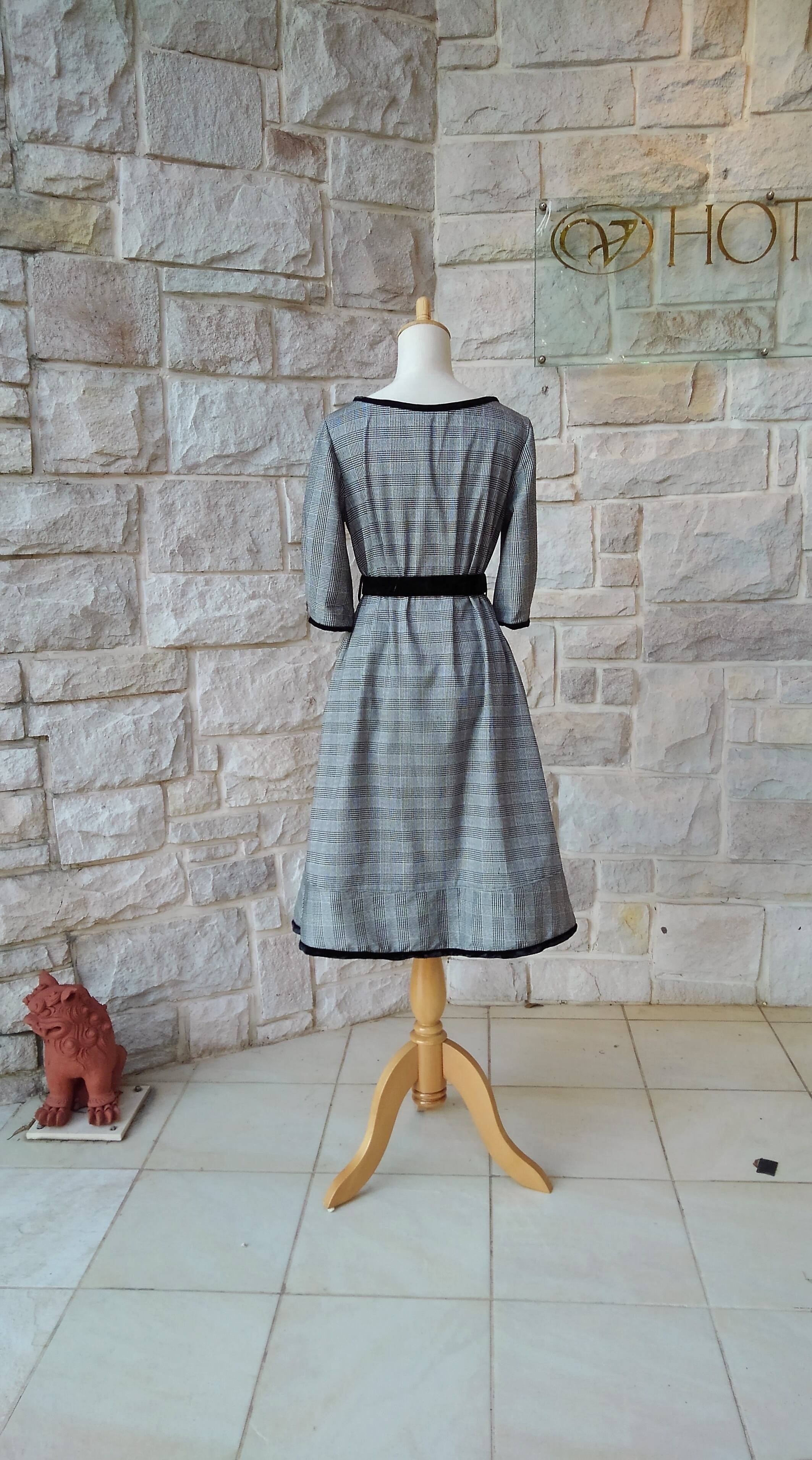 (L) クラシカルワンピース グレンチェック モノトーン コットン ワンピース 七分袖 ポケット付き