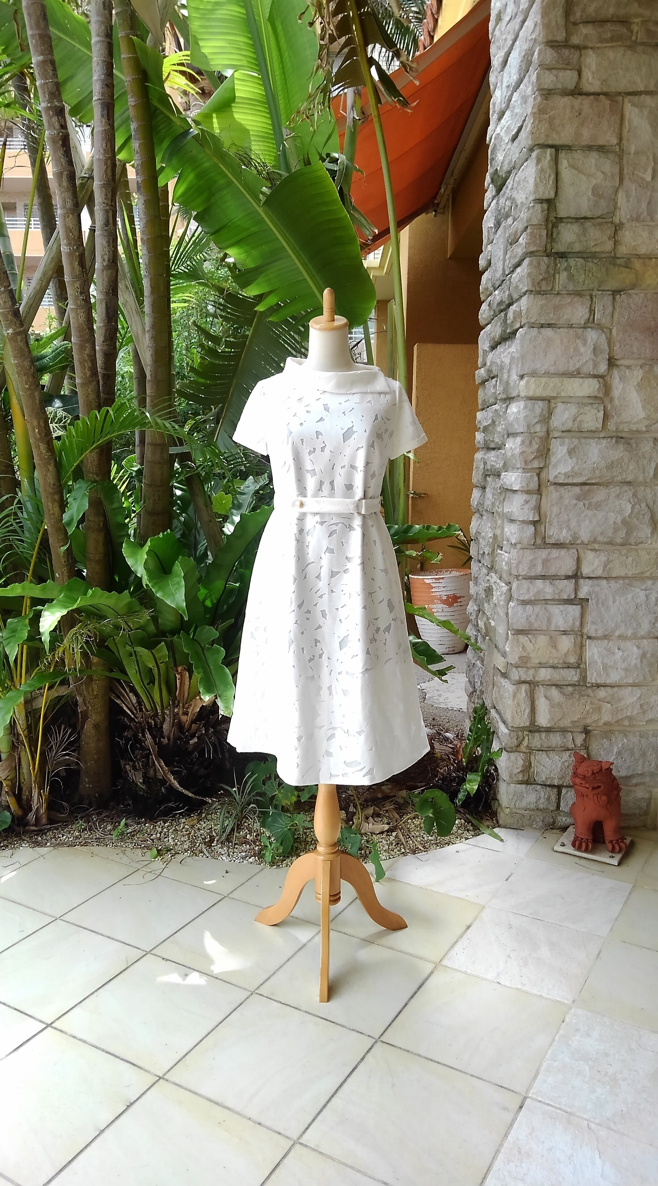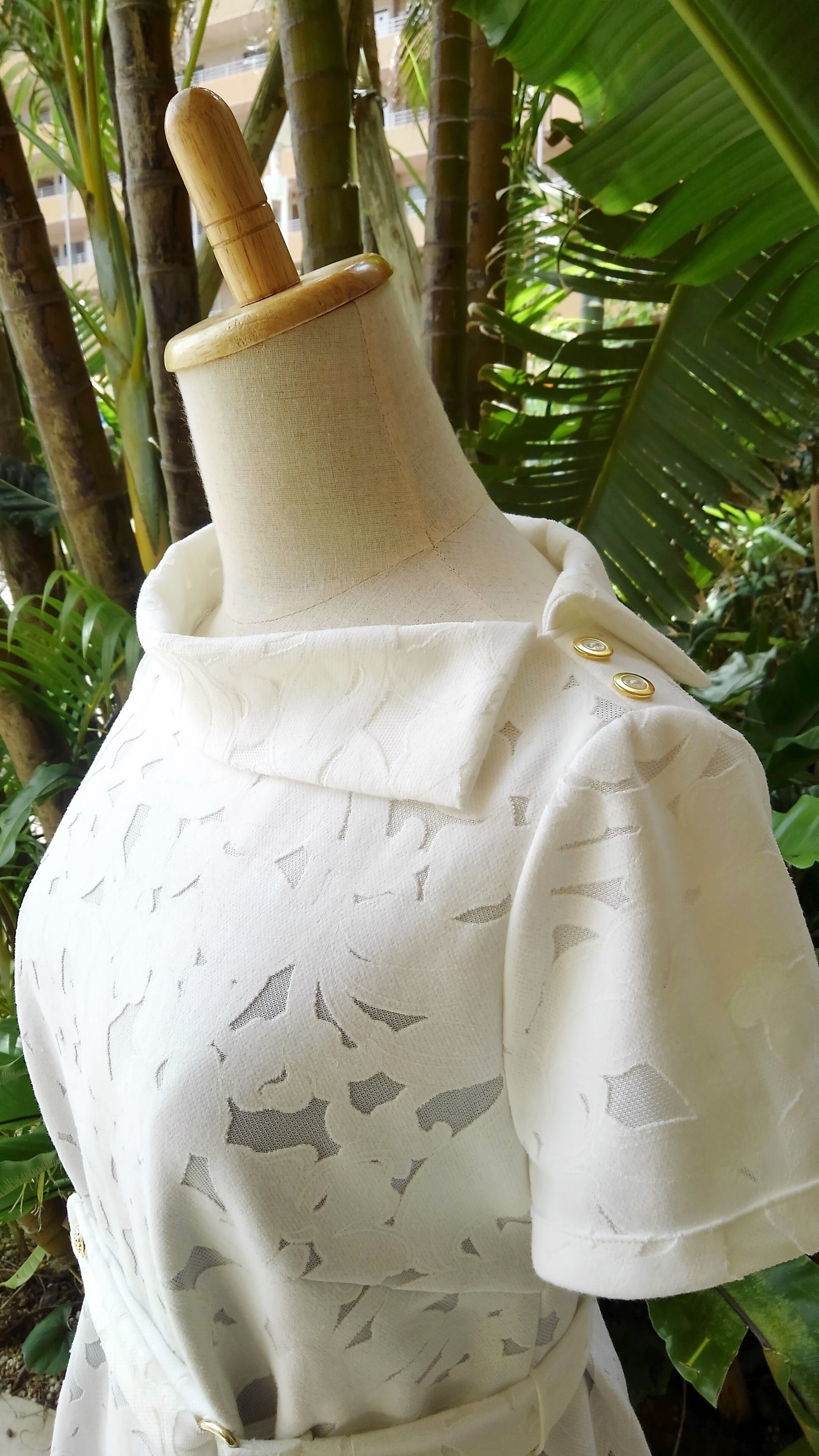 (M) フラワー レリーフ ホワイト リゾート ドレス ワンピース ×ネイビーインナー