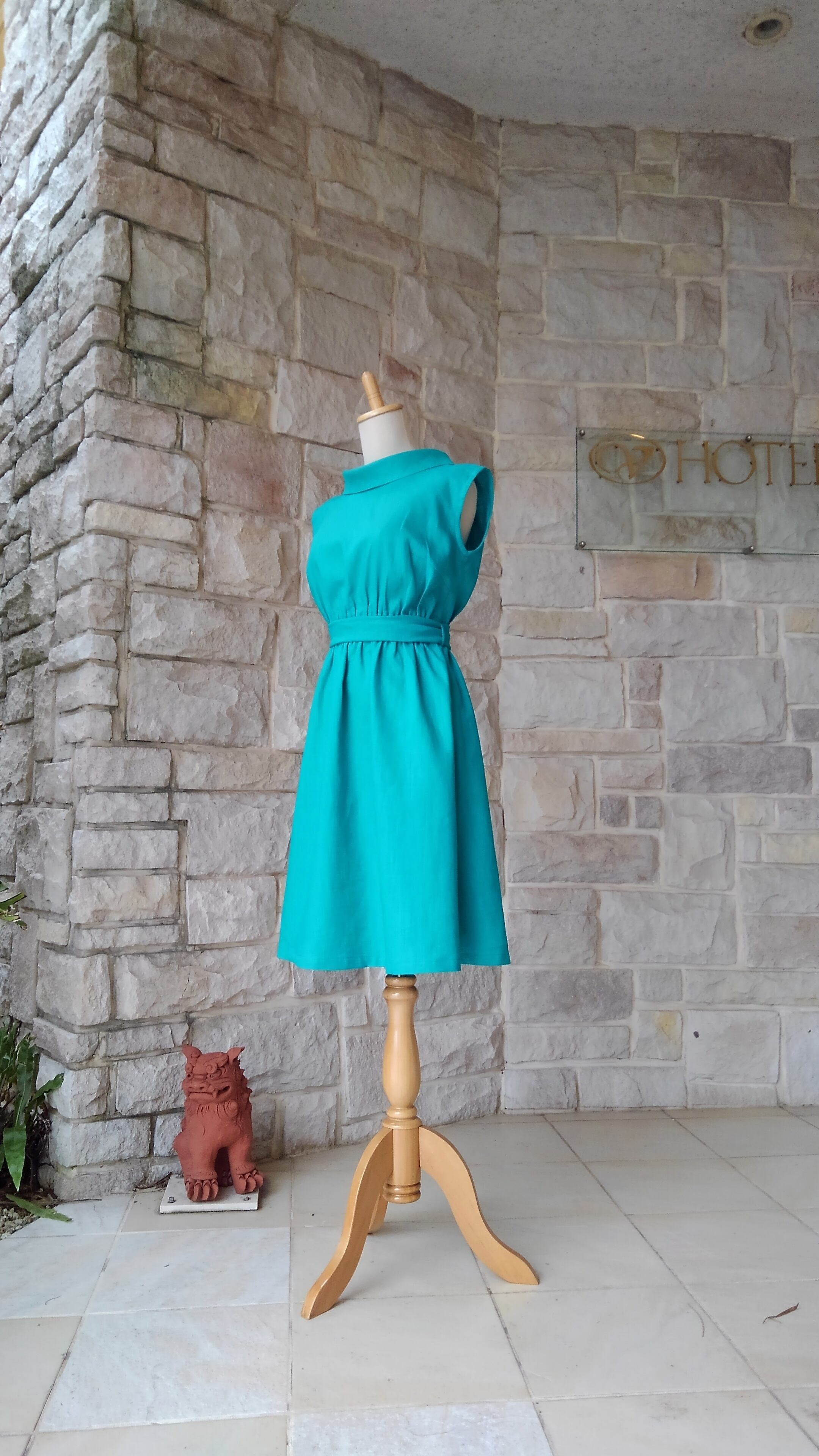 ロールネック 南国の海の色 エメラルドグリーン プレミアムリネン ワンピース フレンチスリーブ ベルト付き