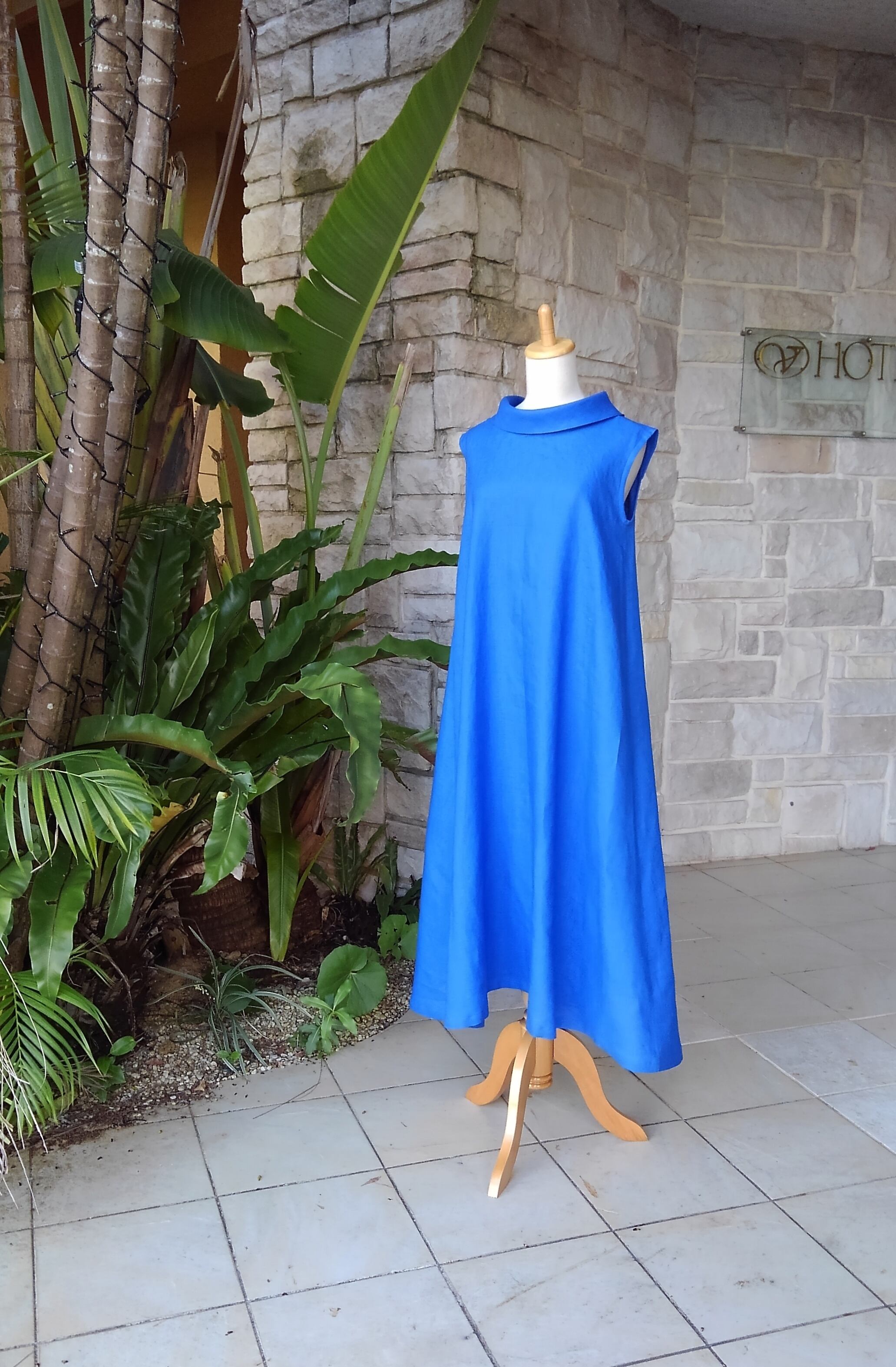 リネン リゾート ロングドレス ロールカラー クラシカルワンピース ロイヤルオーシャンブルー