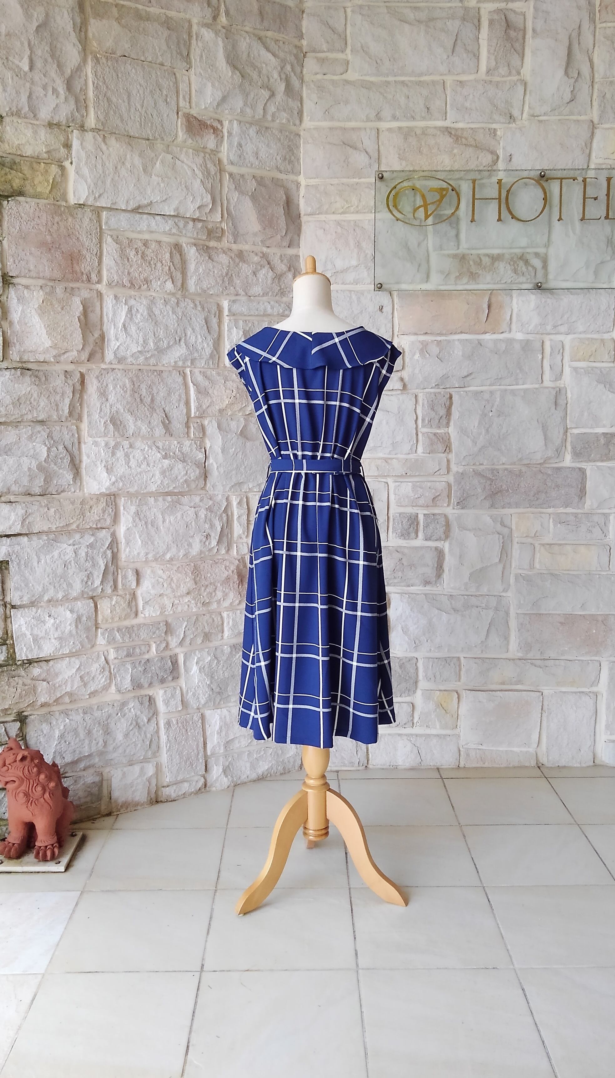 (L)ネイビー×ホワイトライン ビジネス・普段着 使い勝手がいい きちんとしたストレッチ素材ワンピース