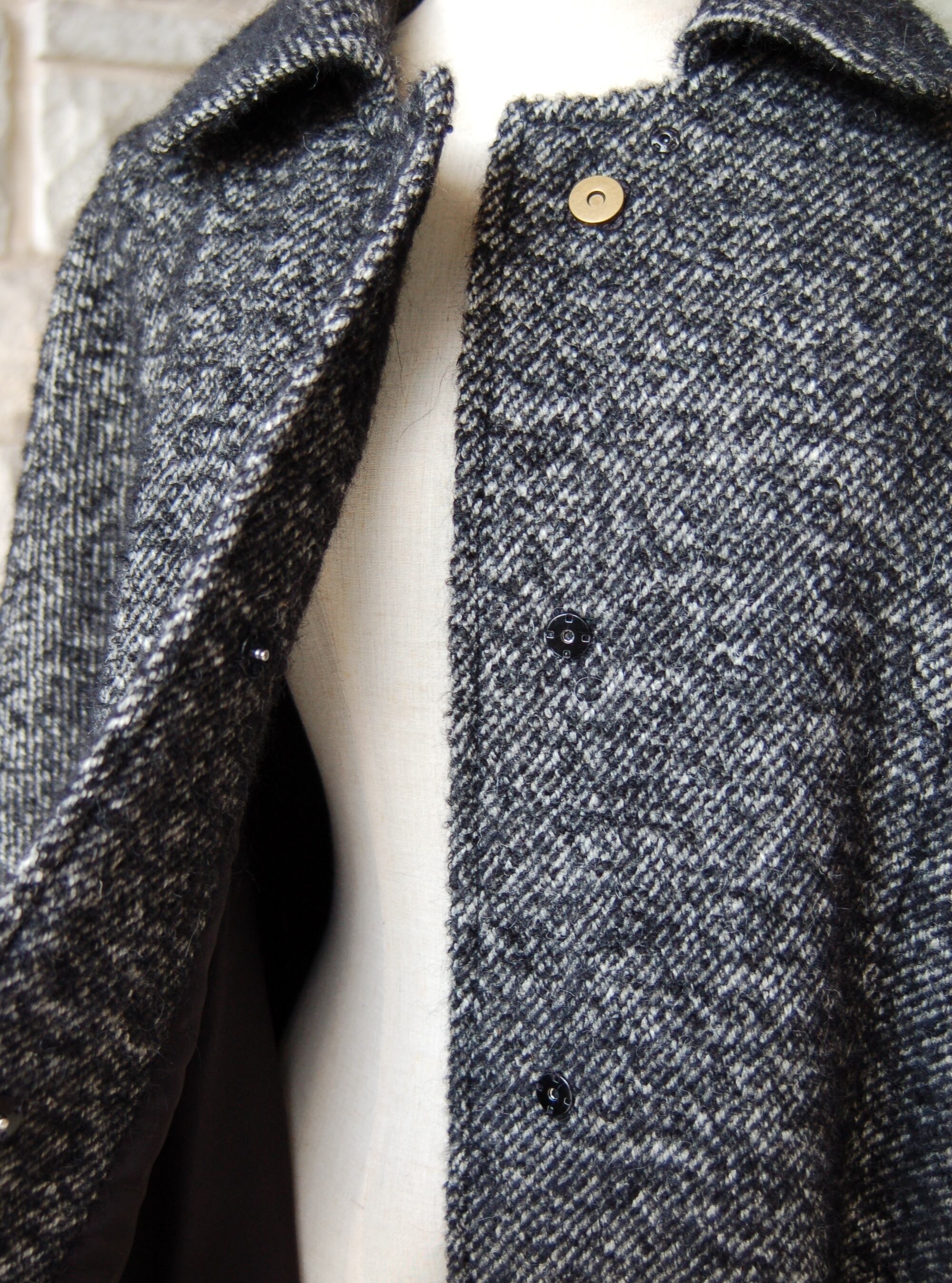 上質なインテリアに使われる大理石や御影石を思わせるランダムグレーのウール生地を使い、ボタンを三か所におつけして、安心感のあるケープコートをお作りしました。