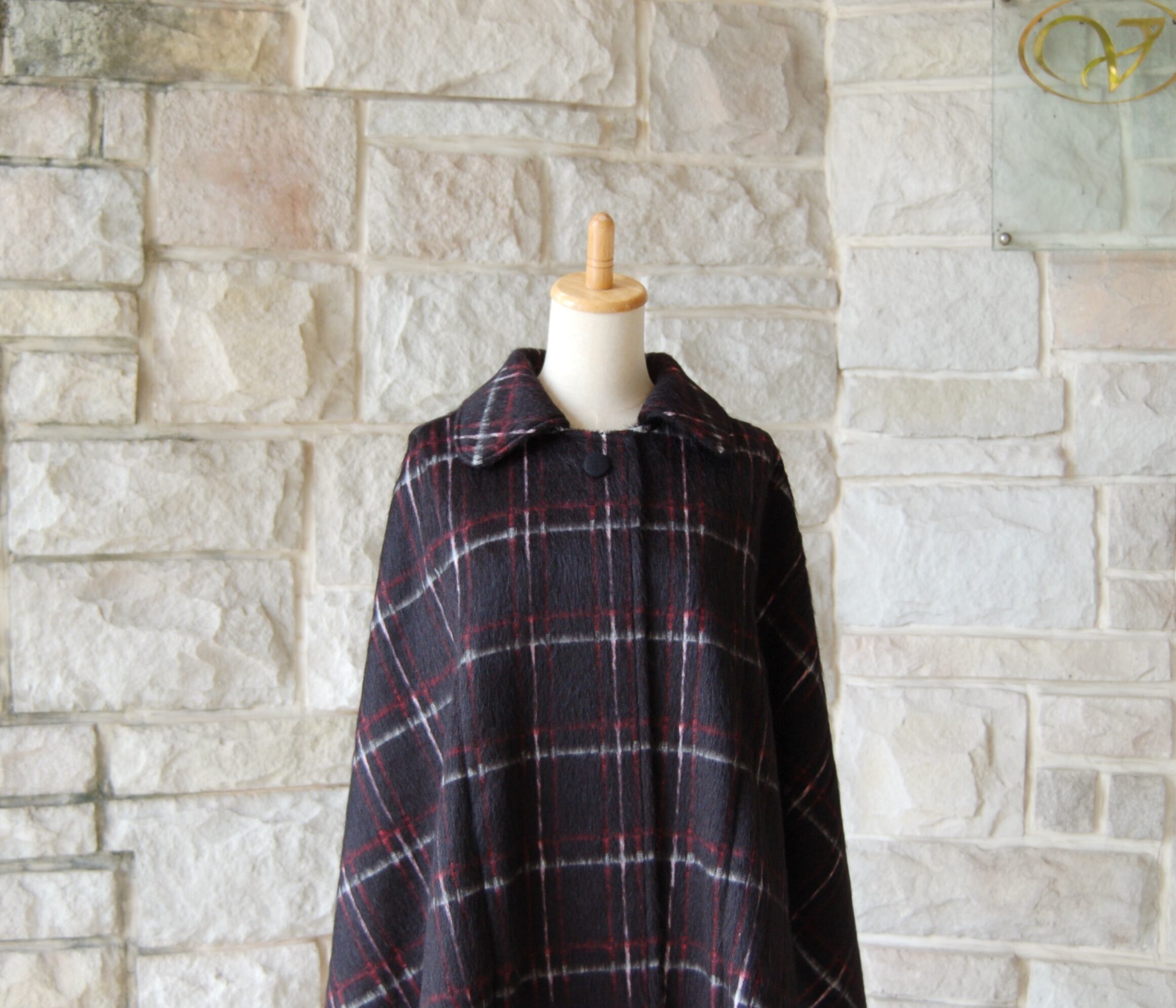 【エレガント ケープコート】黒地に白と赤のラインで格子模様 シックで品がありモダン タイムレスな雰囲気 イタリア製