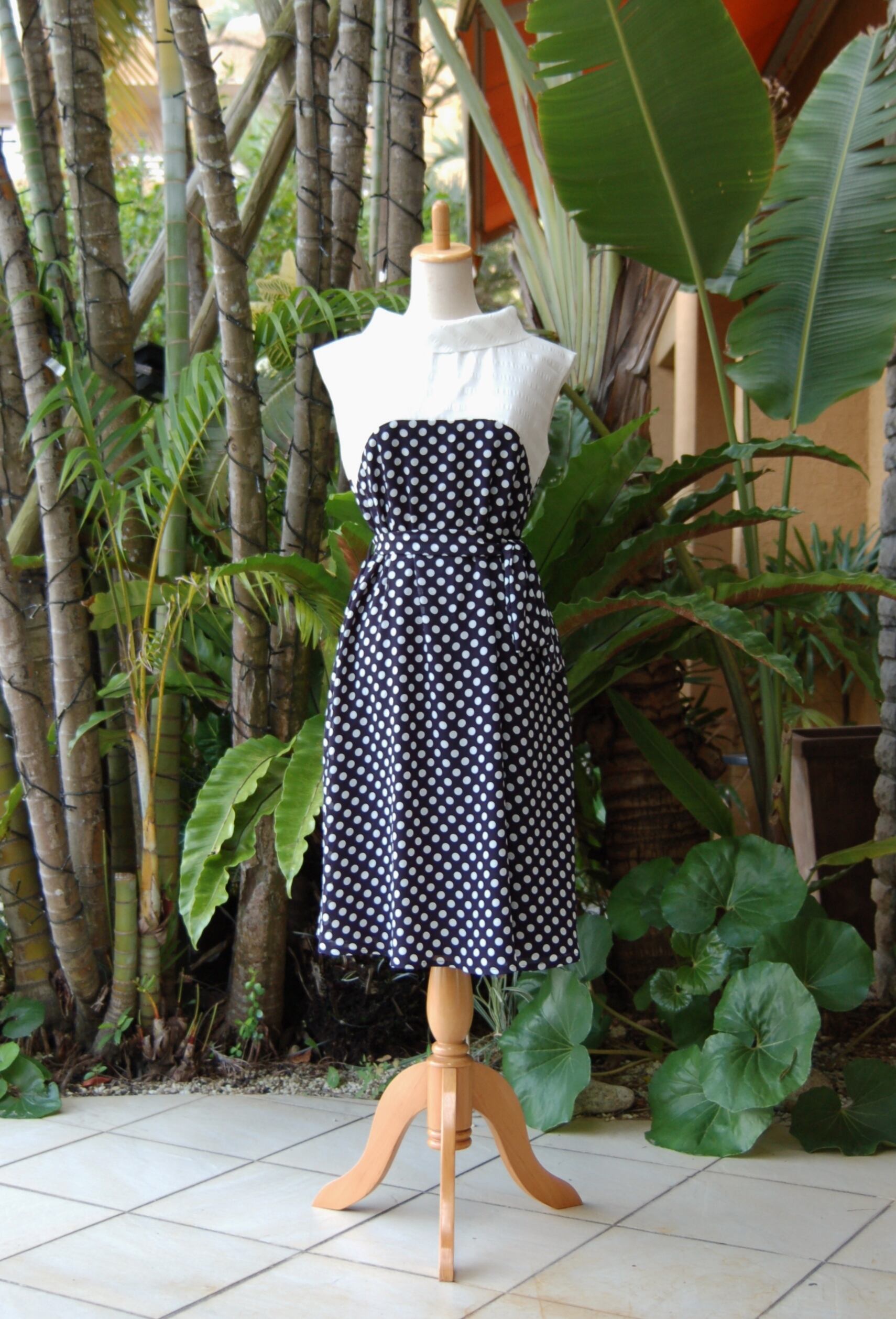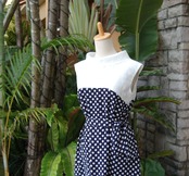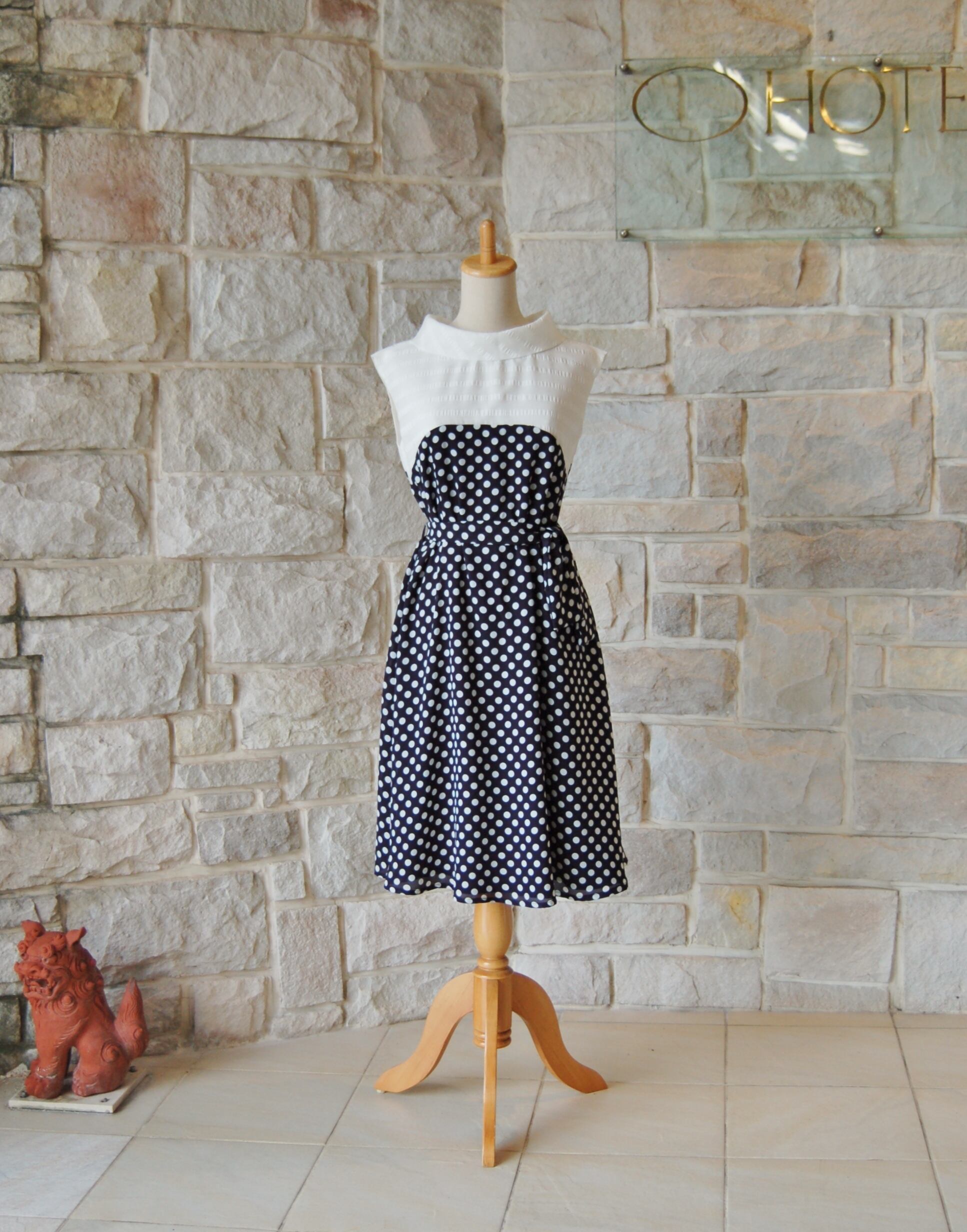 紺地に水玉模様がならんだ清楚な雰囲気のワンピース。