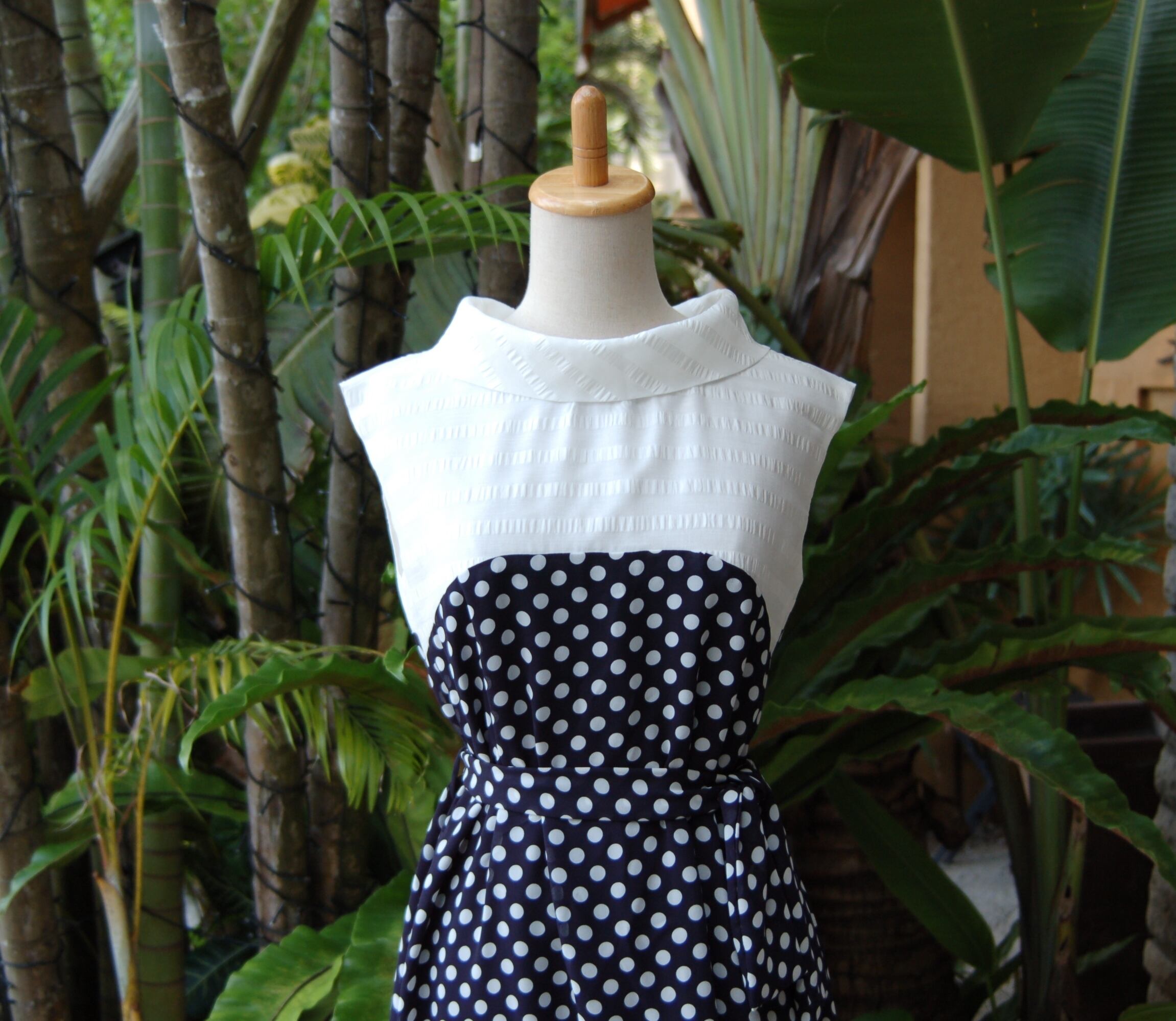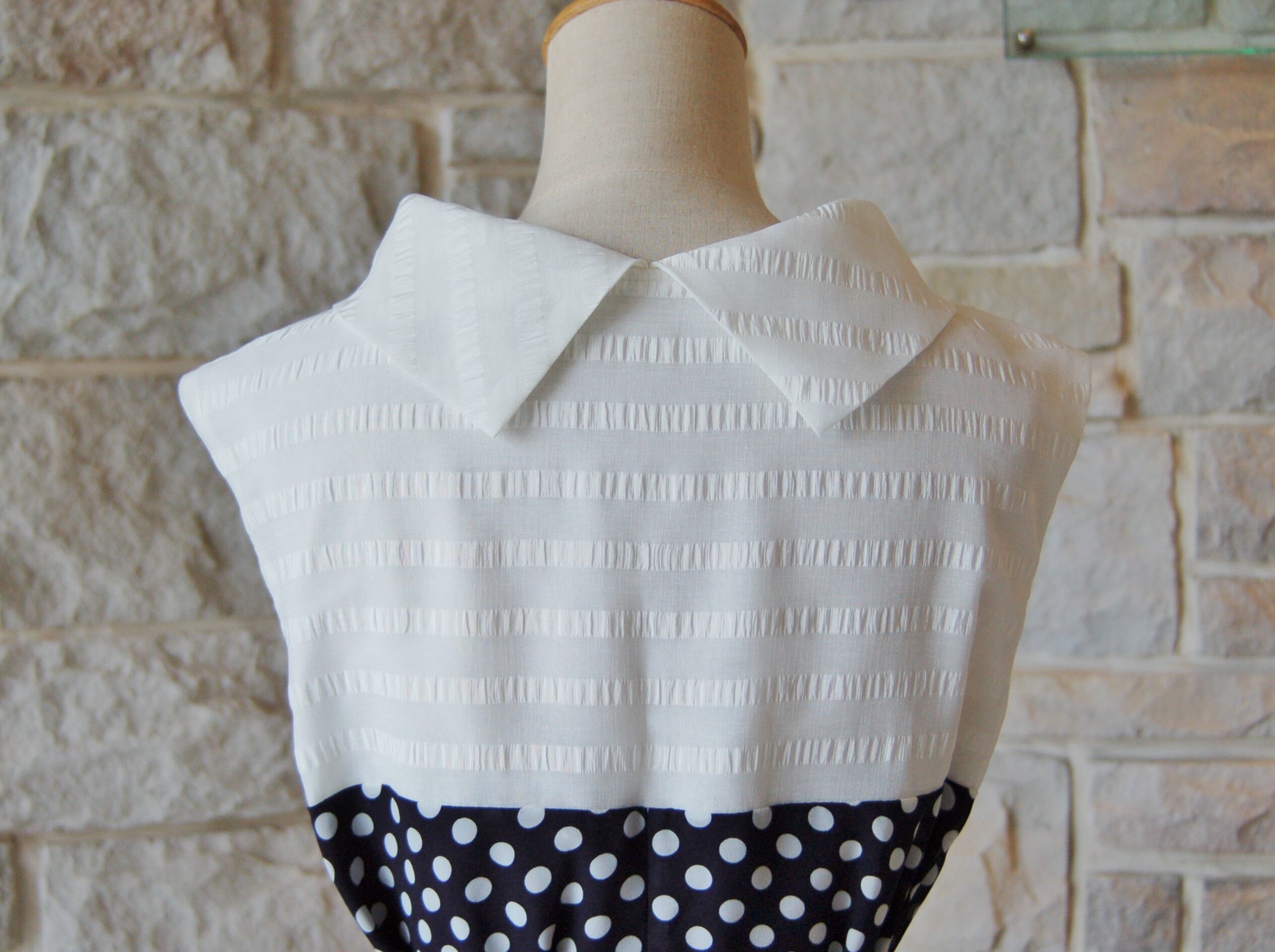 バイカラーワンピース ≪紺地に清楚な水玉×白ボーダー≫ クラシカル ロールカラー ドット 裏地付き