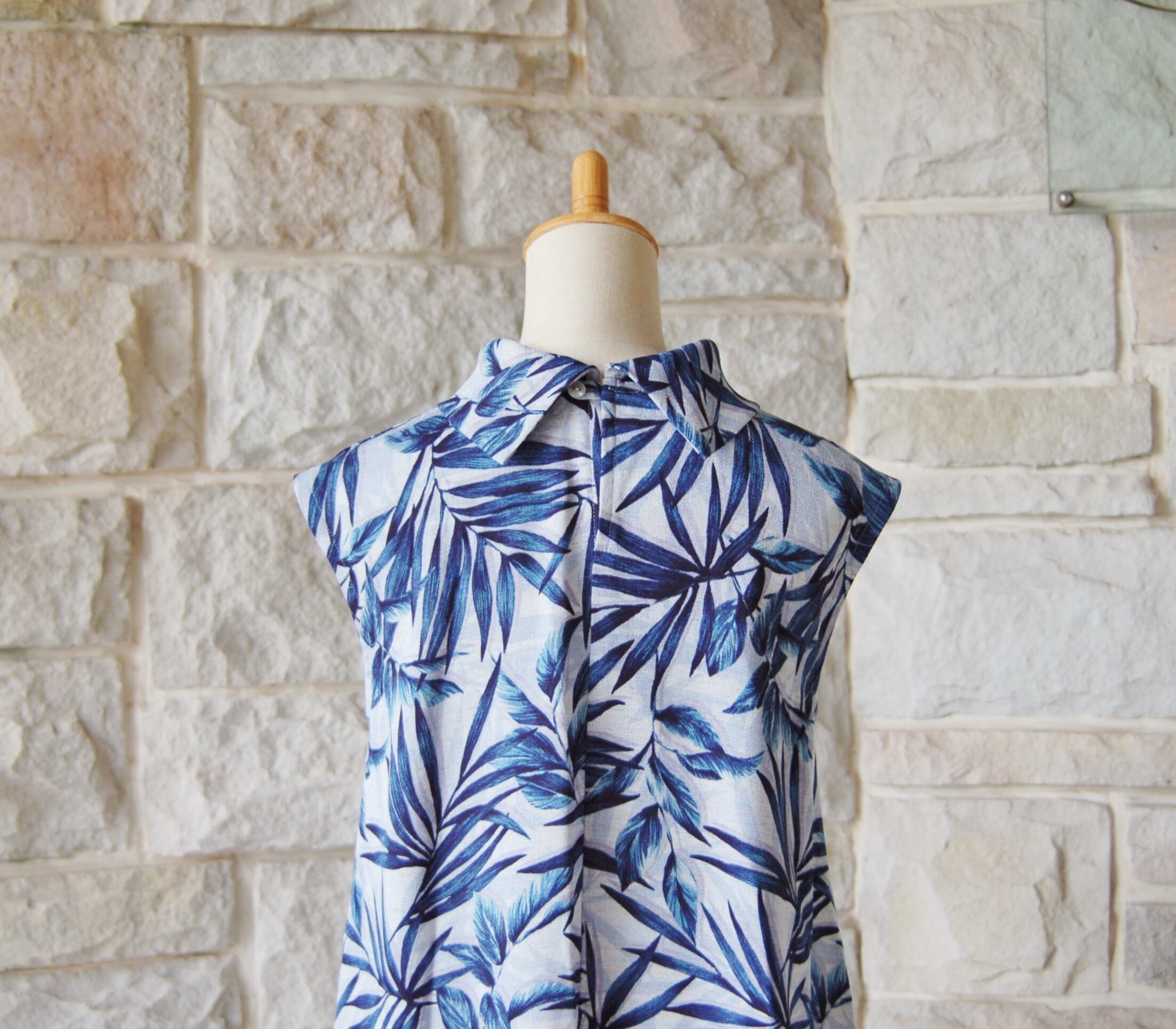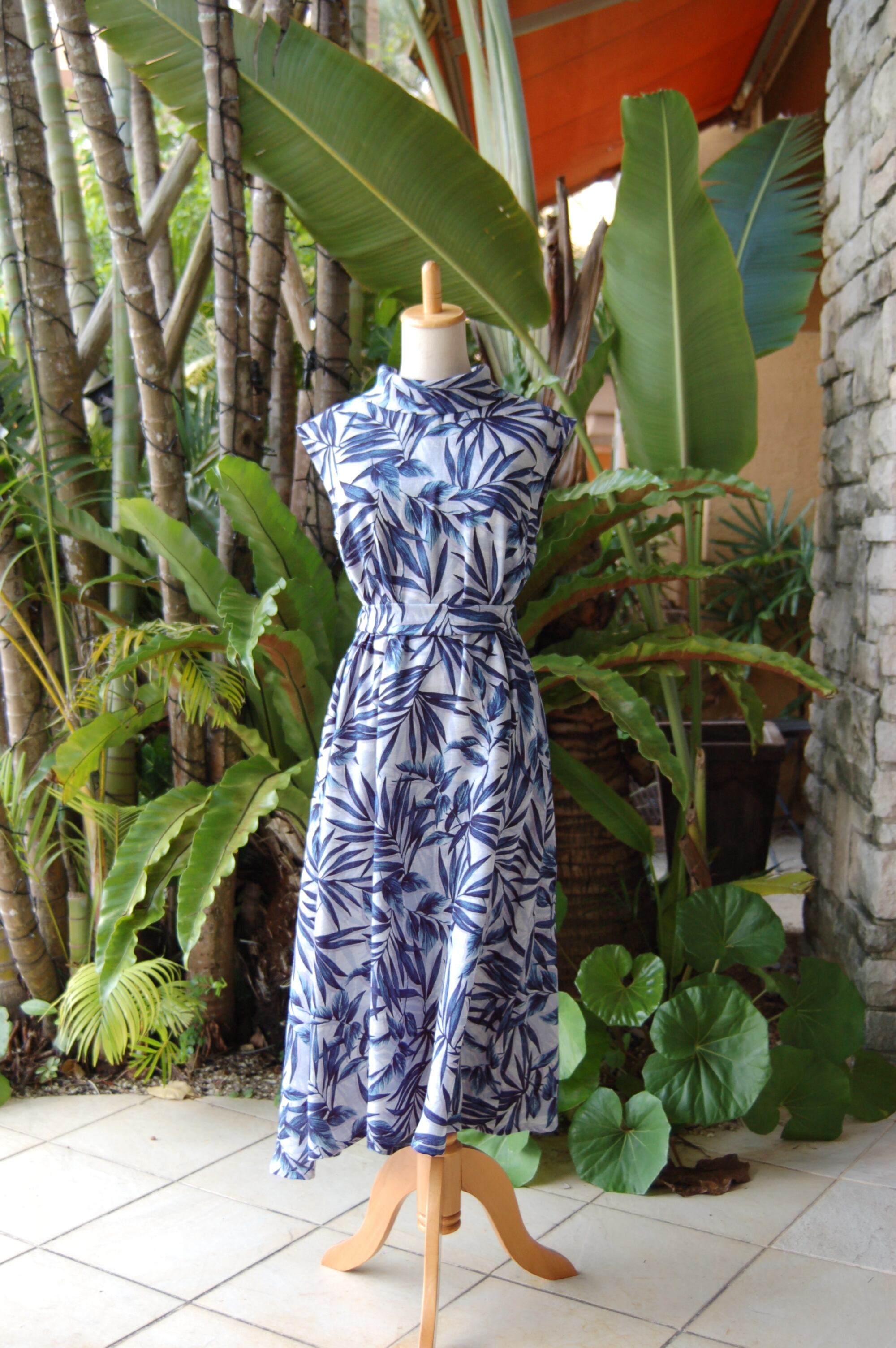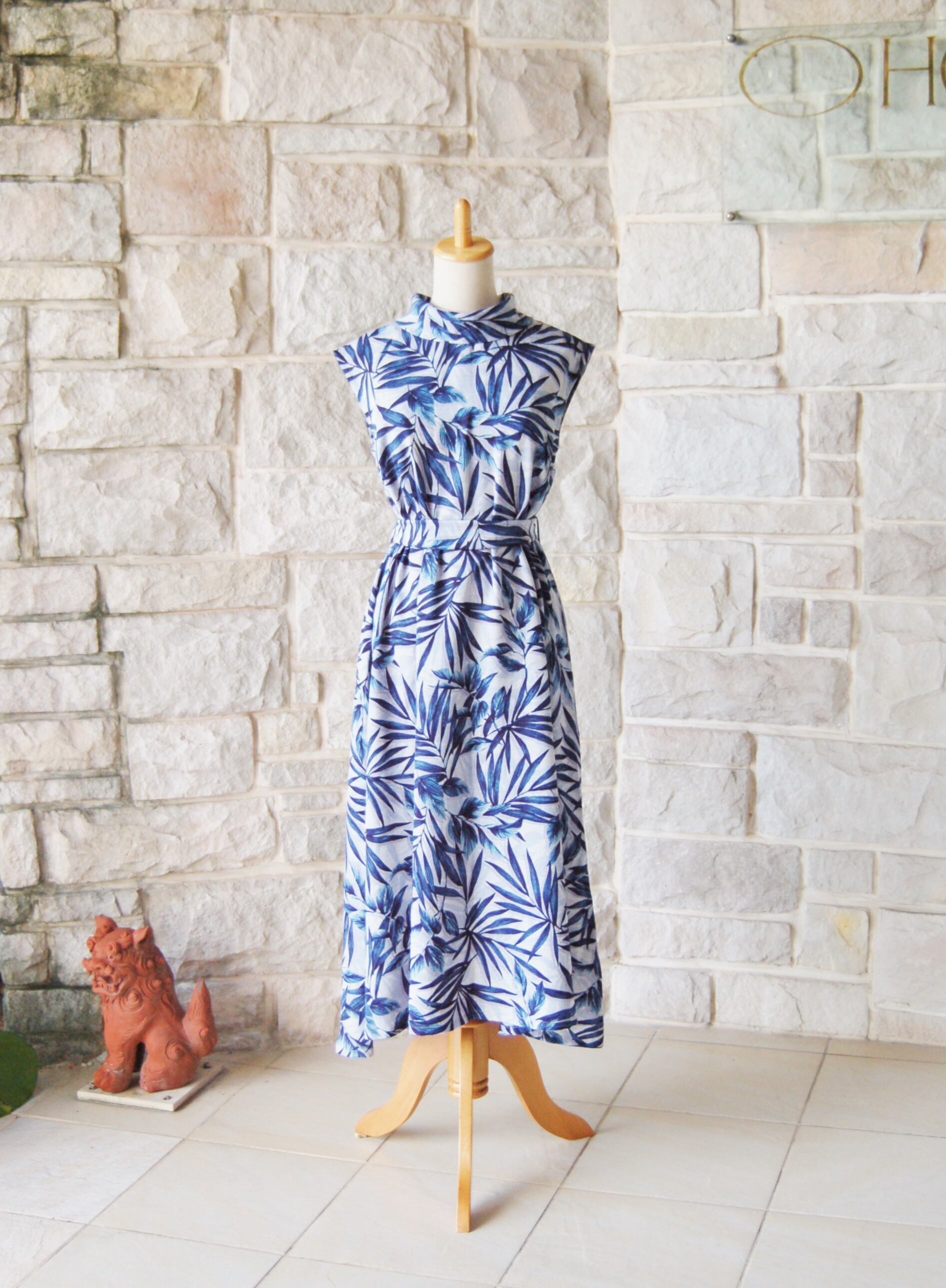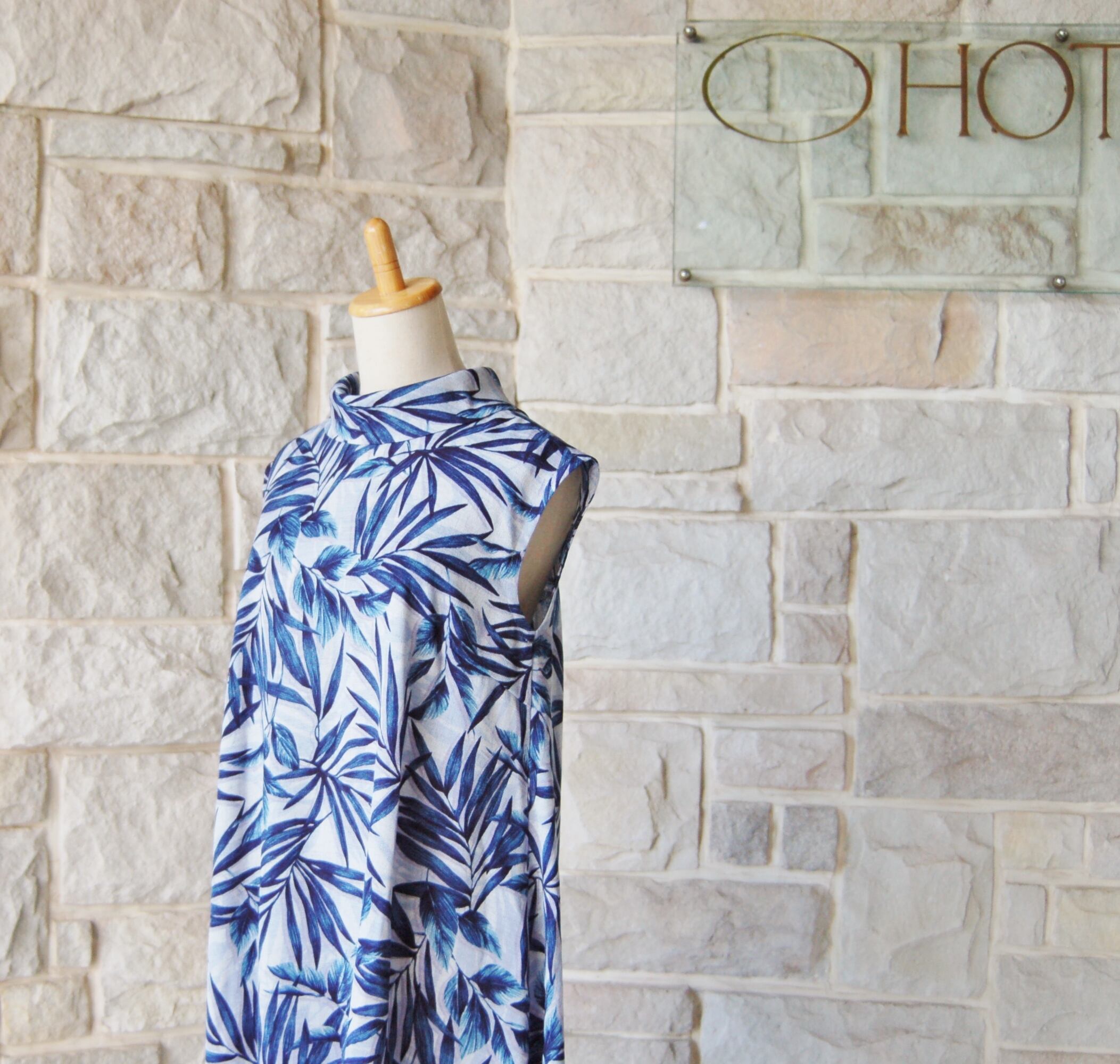 ボタニカル ブルーシャドー シルエットリーフ ロールカラー ロング リゾート フィッシュテール ワンピース