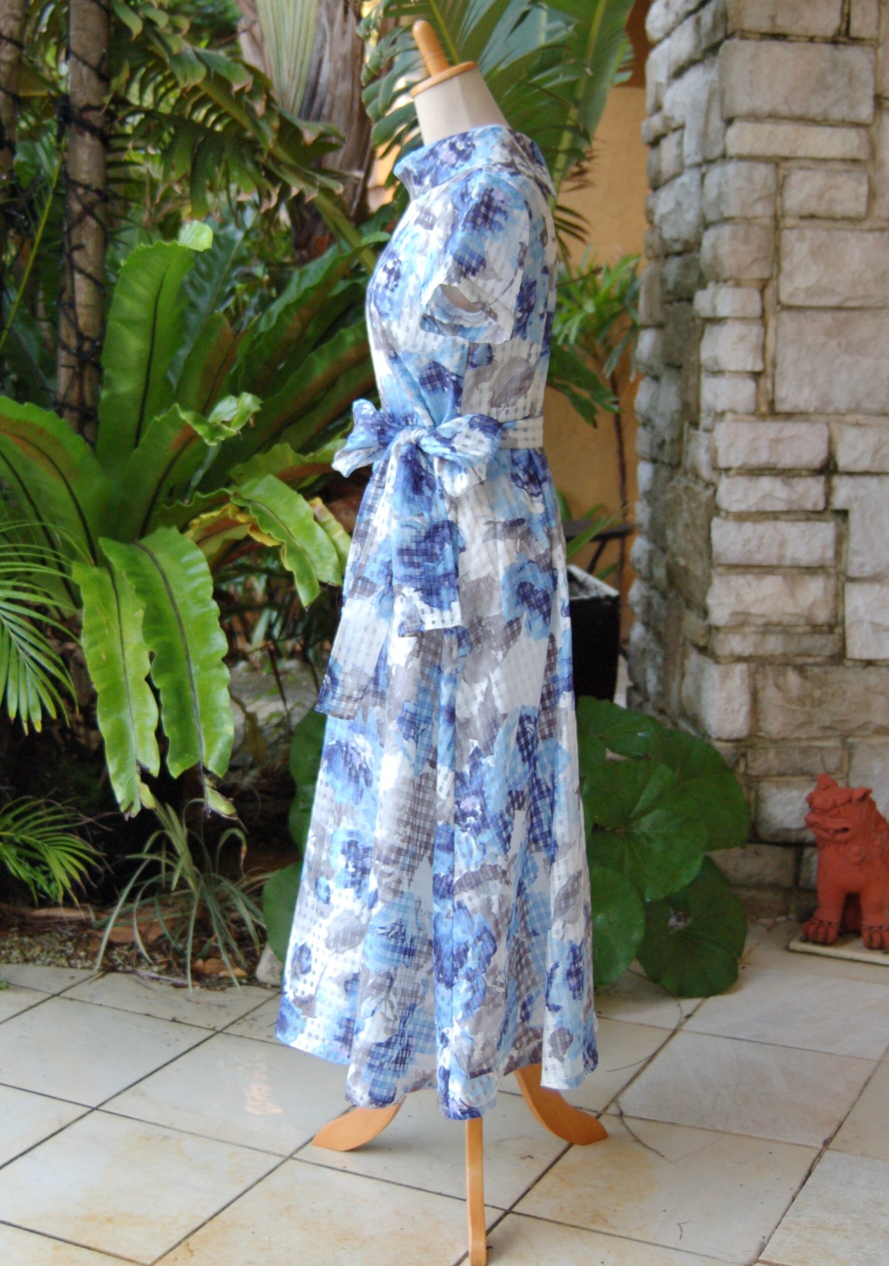 涼し気な碧い花柄のワンピース ロールカラー 半袖 ミモレ丈