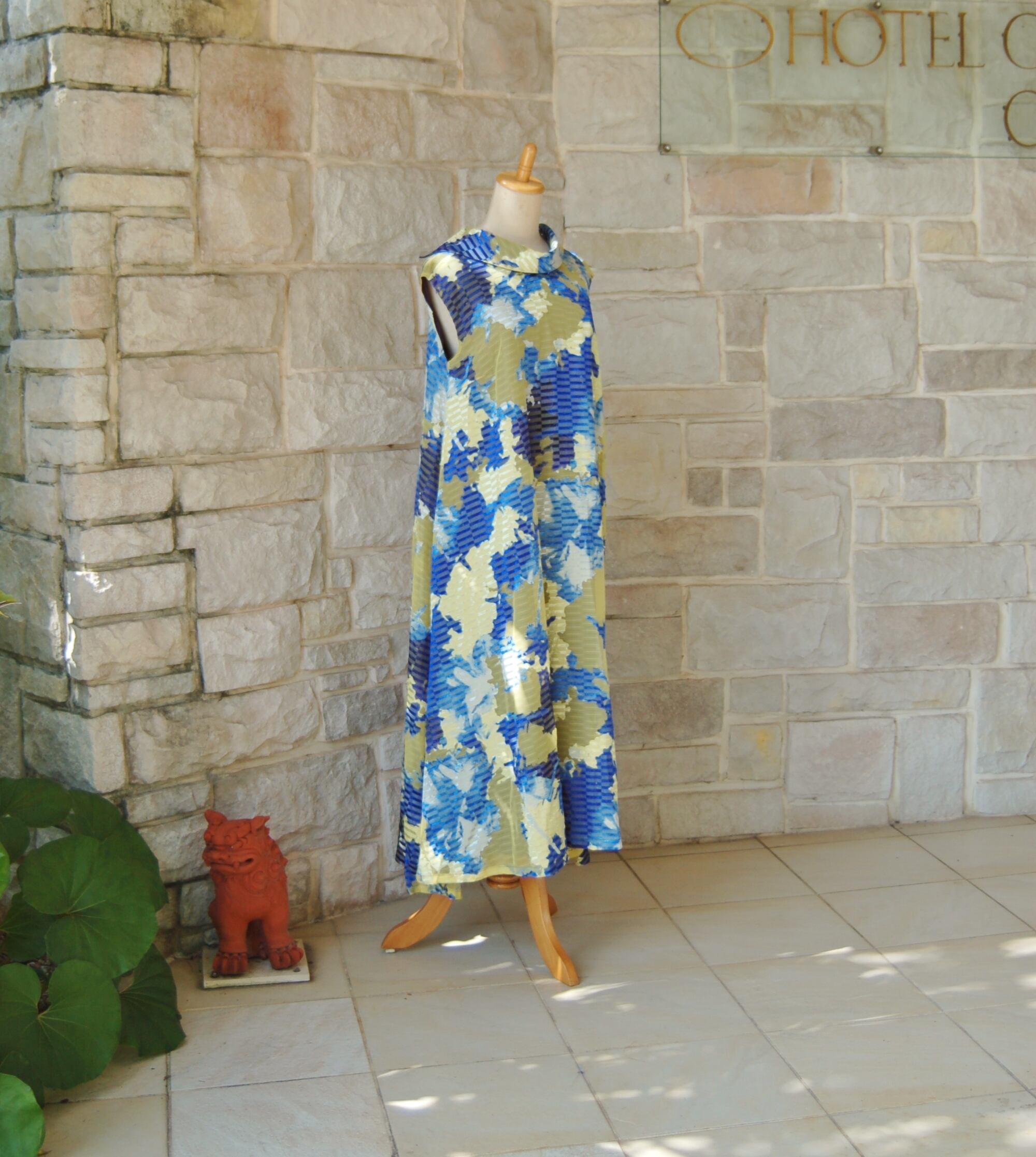 南国の熱帯魚 亜熱帯の蝶 ロールカラー ロング ワンピース 裏地付き