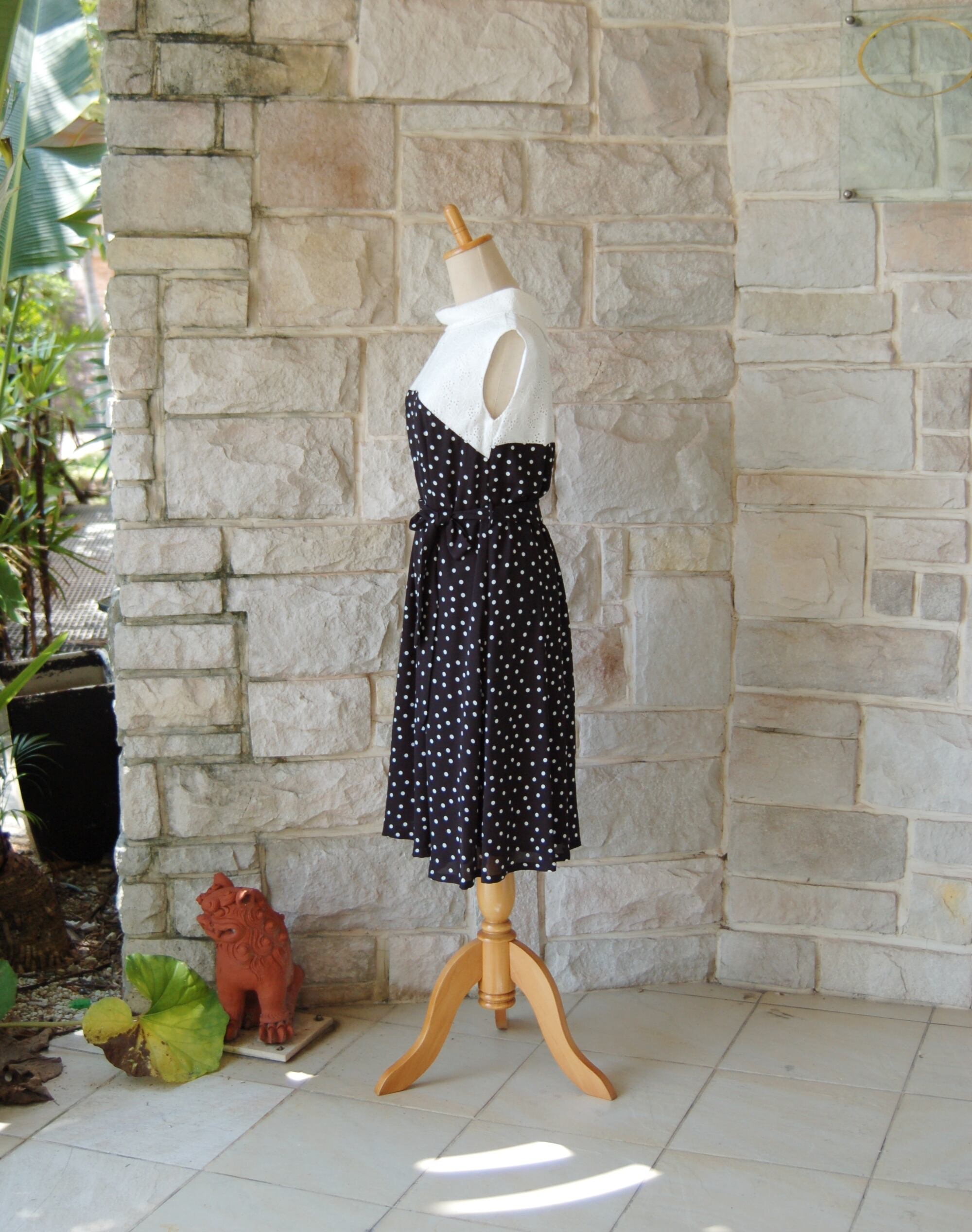 モノトーンランダム水玉(ドット)×オフホワイト刺繍(エンブロイダリー) クラシカル ロールカラー ワンピース バイカラー