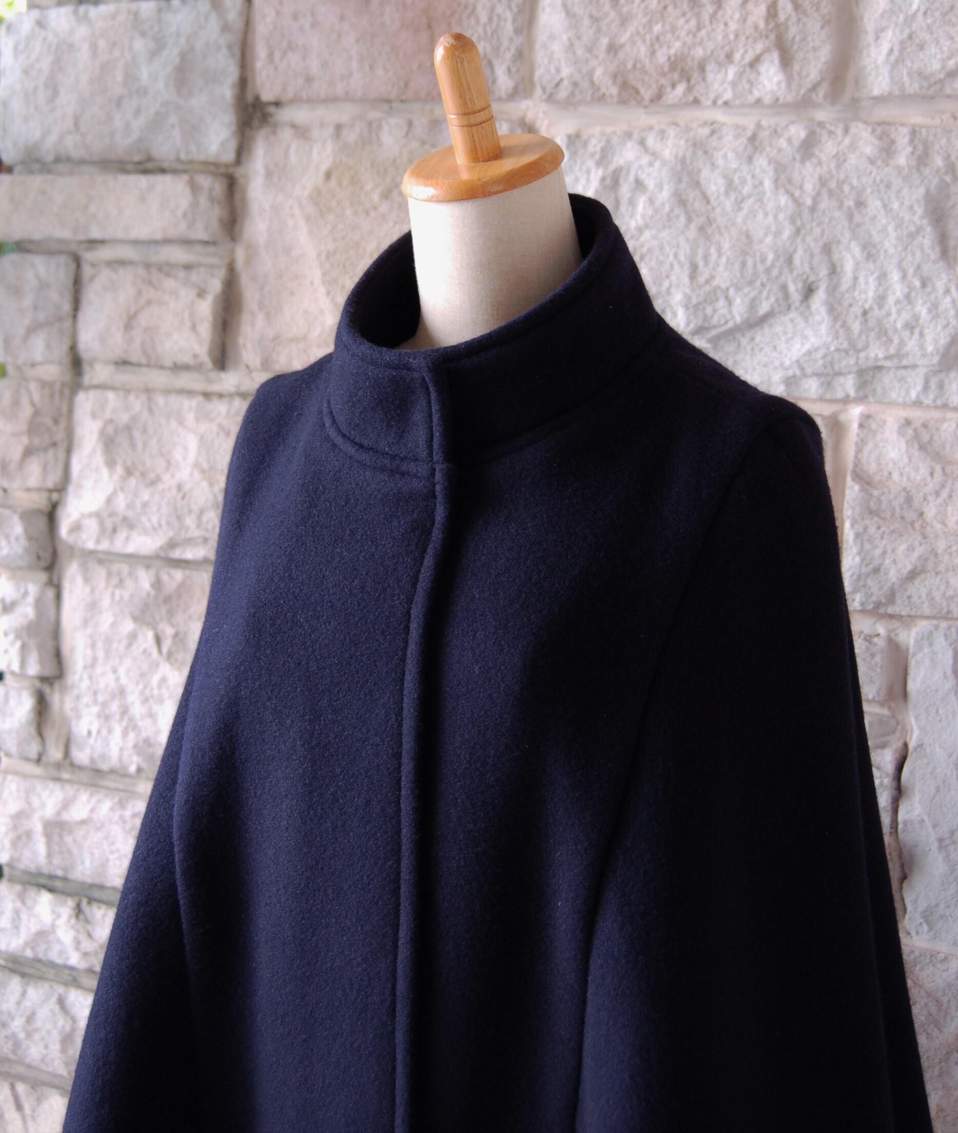 【エレガントケープコート】スタンドカラー ミッドナイトネイビー 黒に見えるほどのダークな紺 ウール・カシミヤ